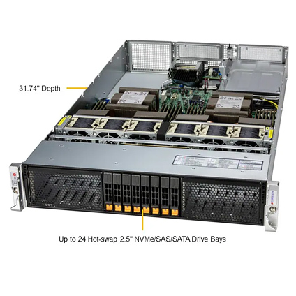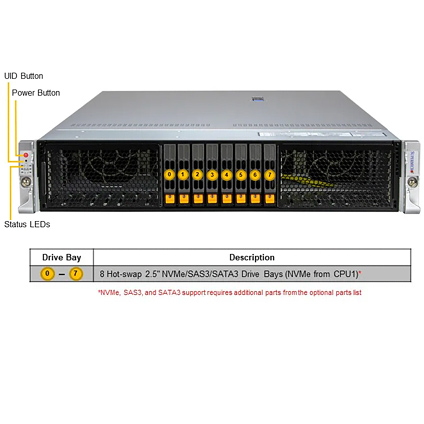 - 8x 2.5" hot-swap NVMe/SATA/SAS drive bays with optional configurations for 16x/24x 2.5" hot-swap NVMe/SAS/SATA drive bays; 2x internal M.2 NVMe drive slots; Optional RAID support via storage add-on card