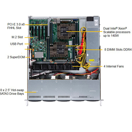 The Supermicro 1029P-MT 19.98" short depth 1U Rackmount server features dual Intel® Xeon® Scalable Processor, supports up to 1.0TB DDR4 ECC 3DS LRDIMM Memory, built-in two gigabit LAN. The Supermicro SuperServer 1029P-MT comes with eight 2.5" hot-swap drive bays, four 40mm cooling fans, and is equipped with 600W High-efficiency platinum Level power supply.