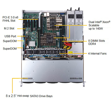The Supermicro 1029P-MTR 19.98" short depth 1U Rackmount server features dual Intel® Xeon® Scalable Processor, supports up to 1.0TB DDR4 ECC 3DS LRDIMM Memory, built-in two gigabit LAN. The Supermicro SuperServer 1029P-MTR comes with eight 2.5" hot-swap drive bays, four 40mm cooling fans, and is equipped with 600W redundant high-efficiency platinum level power supply.