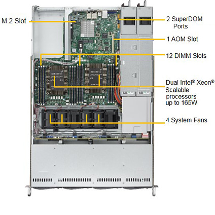 The Supermicro 1029P-WTR 23.5" depth 1U Rackmount server features dual Intel® Xeon® Scalable Processor, supports up to 1.5TB DDR4 ECC 3DS Memory, built-in two Gigabit Ethernet ports and IPMI LAN port. The Supermicro Server 1029P-WTR comes with eight 2.5" hot-swap drive bays. Is equipped with four 40mm counter-rotating fans, and 700W/750W redundant platinum Level power supplies.