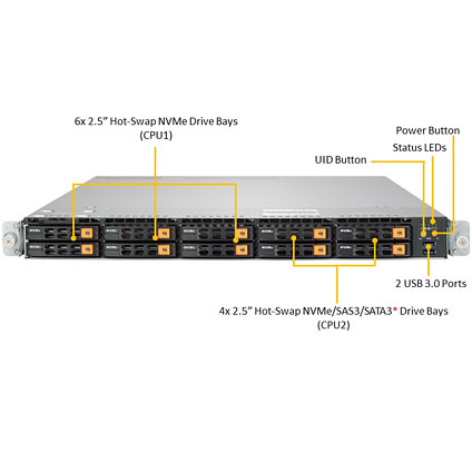 - 10x 2.5" Hot-swap NVMe Drive Bays: (4 hybrid ports - optional SAS3 via AOC)