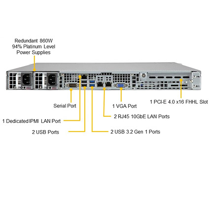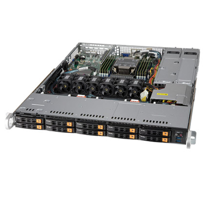 The Supermicro SuperServer 110P-NTR10 1U Rackmount server features 3rd Gen. Intel® Xeon® Scalable Processor, up to 3.0TB Memory, two M.2 slots and dual 10GBase-T LAN ports onboard. The Supermicro Server 110P-NTR10 comes with ten 2.5" hot-swap all NVMe tool-less drive bays, six 40mm heavy duty fans, and is equipped with 860W redundant platinum level power supply.
