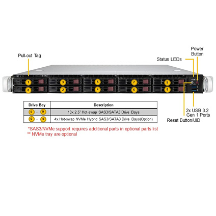 - 10x hot-swap 2.5'' SATA3 drive bays with 4 hybrid NVMe/SATA drive bays, SAS3 with additional SAS controller card