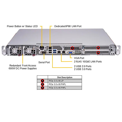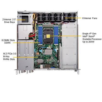 The Supermicro IoT SuperServer 111E-FDWTR 1U 16.9" depth Rackmount server features dual 4th/5th Gen. Intel® Xeon® Scalable Processor, up to 2.0TB DDR5 ECC RDIMM/LRDIMM Memory, one NVMe M.2 slot. The Supermicro Server 111E-FDWTR supports 2x 2.5" SATA drive bays, six heavy duty fans, and is equipped 600W redundant power supply.
