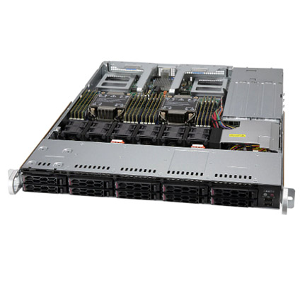 The Supermicro SuperServer 120C-TN10R 1U 23.5" depth Rackmount server features dual 3rd Gen. Intel® Xeon® Scalable Processor, up to 6.0TB DDR4 RDIMM/LRDIMM Memory, two NVMe M.2 slots. The Supermicro Server 120C-TN10R comes with 10x 2.5" hot-swap NVMe/SATA/SAS drive bays, six 40mm counter-rotating fans, and is equipped 860W redundant platinum level power supply.