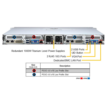 The Supermicro Twin SuperServer 120TP-DTTR is a 28.25" depth 1U 2-nodes high performance rackmount server. Each nodes supports dual 3rd Gen. Intel Xeon Scalable Processor, up to 4.0TB DDR4 ECC RDIMM/LRDIMM memory. The 120TP-DTTR 1U Racknount Server comes with 8x hot-swap 2.5" SATA drive bays, six 40mm counter rotating fans, and is equipped with 1000W redundant Titanium level power supply.