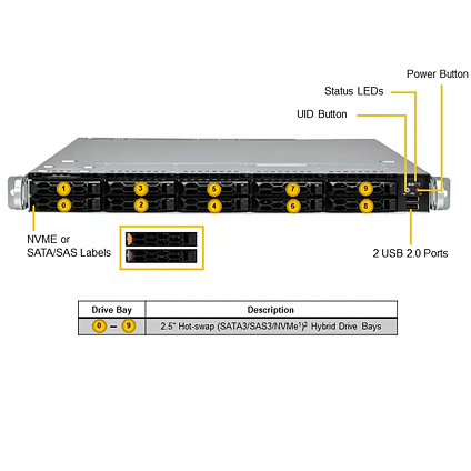 - 10x hot-swap hybrid NVMe/SATA/SAS drive bays