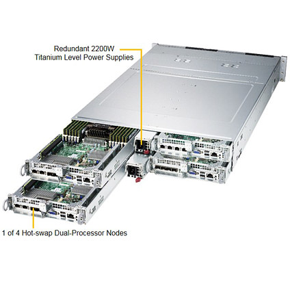 The Supermicro SuperServer 2029BT-HNC0R is an 28.75" depth 2U 4x nodes high performance rackmount server. Each nodes supports dual Intel® Xeon® Scalable Processor, up to 3TB DDR4 ECC 3DS LRDIMM. The 2029BT-HNC0R 2U BigTwin Racknount Server supports up to 24 hot-swap SAS3 bays; or 16 all-flash NVMe drives and 8 SAS3 hot-swap 2.5" drive bays. And it is equipped with four 80mm heavy duty fans, and 1200W redundant Titanium level power supply.