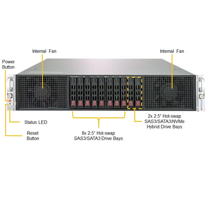 - 8x Hot-swap 2.5" SAS/SATA Drive Bays, 2x Hot-swap 2.5" SAS/SATA/NVMe Drive Bays