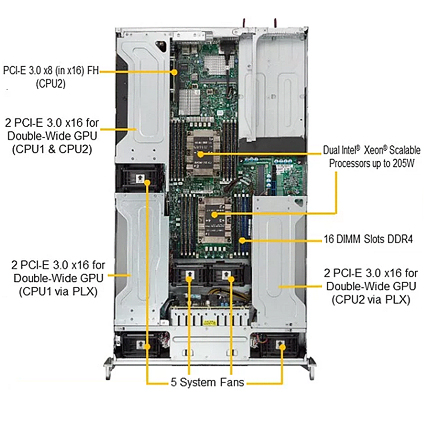 The Supermicro Server 2029GP-TR is a 31" depth 2U Rackmount server that features dual Intel® Xeon® Scalable Processor, up to 2.0TB DDR4 ECC 3DS LRDIMM Memory, supports up to six optional GPU cards. The Supermicro SuperServer 2029GP-TR comes with eight 2.5" hot-swap SAS/SATA drive bays, two 2.5" SAS/SATA/NVMe drive bays, five 80mm heavy duty fans, and is equipped with 1000W redundant Platinum level power supply.