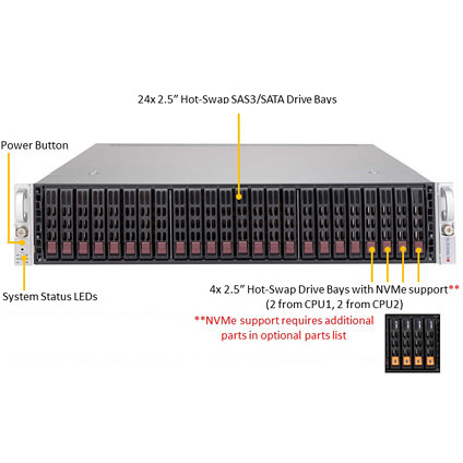 - 24x 2.5" Hot-swap Drive Bays: 24 SAS3 via Optional Add-on Card (4x Hybrid Ports - Optional 4x NVMe)