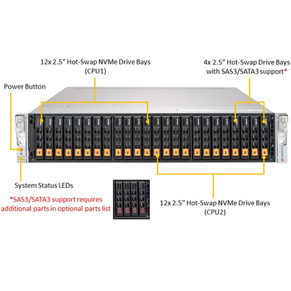 - 24x 2.5" Hot-swap Drive Bays: 24x NVMe (4x Hybrid Ports - SAS3 via Optional Add-on Card)