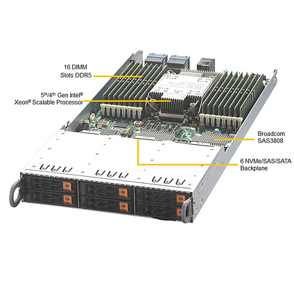 The Supermicro GrandTwin SuperServer 211GT-HNC8R is a 28" depth 2U 4-nodes high performance rackmount server. Each nodes supports Single-Socket 4th/5th Gen Intel Xeon Scalable processor, 16x DIMM slots supports up to 4.0TB ECC DDR5 ECC RDIMM memory. The Supermicro Server 211GT-HNC8R comes with 24x hot-swap 2.5" NVME/SAS/SATA drive bays, is equipped with 2200W redundant titanium level power supply.