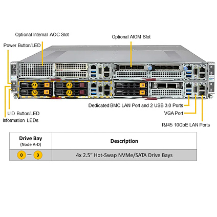 HPC, Cloud Gaming, MEC (Multi-Access Edge Computing), Multi-Purpose CDN, High-availability Cache Cluster, Telco Edge Cloud, EDA (Electric Design Automation), Mission Critical Web ApplicationsFour Hot-pluggable Systems (Nodes) in a 2U Form Factor. Each Node Supports the Following: