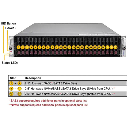 Intel® Optane™ Persistent Memory 200 series - 22x Hot-swap 2.5'' NVMe/SATA/SAS drive bays, + 2x 2.5" hot-swap SATA/SAS drive bays