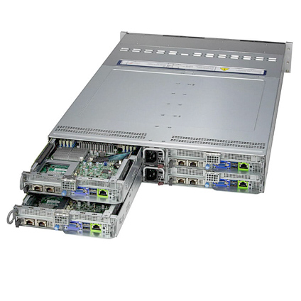 The Supermicro BigTwin SuperServer 221BT-HNTR is a 28.75" depth 2U 4-nodes high performance rackmount server. Each nodes supports dual 4th/5th Gen Intel Xeon Scalable Processor, 16x DIMM slots supports up to 4.0TB ECC DDR5 RDIMM memory. The Supermicro Server 221BT-HNTR comes with 24x hot-swap 2.5" NVME/SATA drive bays, is equipped with 3000W redundant titanium level power supply.