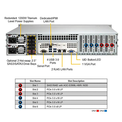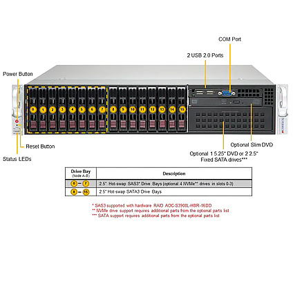 - 16x Hot-swap 2.5" Drive Bays with 8 SAS RAID (0, 1, 5, 6, 10, 50, 60) and 8 SATA Drive Support