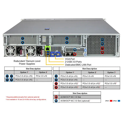 - Optional PCIe slot configurations up to 8 PCIe 5.0 x8 or 4 PCIe 5.0 x16 slots with support for double-width GPU/Accelerator cards