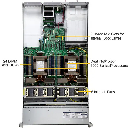 - Dual Intel Xeon 6900-Series Processors with P-cores up to 500W