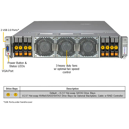 - 8x 2.5" Hot-swap NVMe/SAS3/SATA3 drive bays (Default with 8 SAS3/SATA3 drive bays);