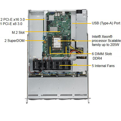 The Supermicro 5019P-WT 25.6" depth 1U Rackmount server features Intel® Xeon® Scalable Processor, supports up to 768GB DDR4 ECC 3DS LRDIMM Memory, built-in two 10GBase-T ports and IPMI LAN port. The Supermicro Server 5019P-WT comes with four 3.5" hot-swap drive bays, is equipped with five 40mm counter-rotating PWM fans, and 600W high-efficiency power supply.