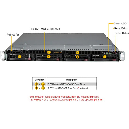 - 4x hot-swap 3.5" SATA3 drive bays, SAS3 with additional SAS controller card