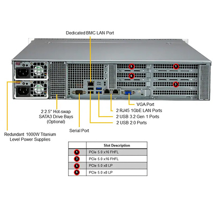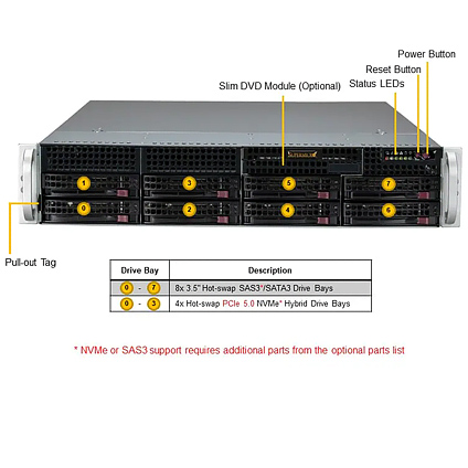 - 8x front hot-swap 3.5" SATA3 drive bays (Optional 4 hybrid Gen5 NVMe), SAS3 with additional SAS controller card