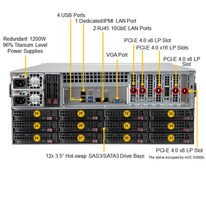 - 36x Hot-swap 3.5" SAS3/SATA3 Drive Bays (24 Front + 12 Rear), 2x Hot-swap 2.5" NVMe/SATA (Rear, Optional); 2x Internal Fixed Bay Support up to 4x 2.5" Drive Bays (Optional)