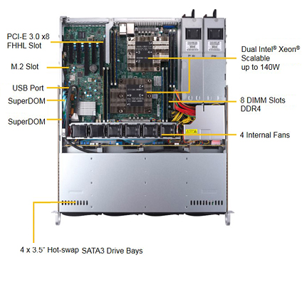 The Supermicro 6019P-MTR 19.98" short depth 1U Rackmount server features dual Intel® Xeon® Scalable Processor, supports up to 1.0TB DDR4 ECC 3DS LRDIMM Memory, built-in two gigabit LAN. The Supermicro SuperServer 6019P-MTR comes with four 3.5" hot-swap drive bays, four 40mm cooling fans, and is equipped with 600W redundant platinum Level power supply.