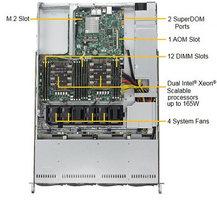 The Supermicro 6019P-WT 25.6" depth 1U Rackmount server features dual Intel® Xeon® Scalable Processor, supports up to 1.5TB DDR4 ECC 3DS LRDIMM Memory, built-in two Gigabit Ethernet ports and IPMI LAN port. The Supermicro Server 6019P-WT comes with four 3.5" hot-swap drive bays, is equipped with four 40mm counter-rotating PWM fans, and 600W high-efficiency power supply.
