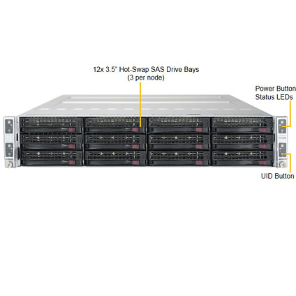 The Supermicro SuperServer 6029TP-HC0R is a 30.5" depth 2U 4x nodes high performance rackmount server. Each nodes supports dual Intel® Xeon® Scalable Processor, up to 2.0TB memory. The 6029TP-HC0R 2U Racknount Server comes with twelve hot-swap 3.5" SAS/SATA drive bays with Broadcom 3008 SAS3 12Gb/s controller, four 80mm heavy duty fans, and is equipped with 1200W redundant Titanium level power supply.