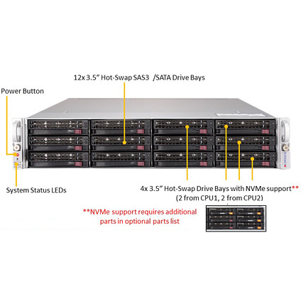 - 12x 3.5" Hot-swap Drive Bays: 12 SAS3 via Optional Add-on Card (4x Hybrid Ports - Optional 4x NVMe)