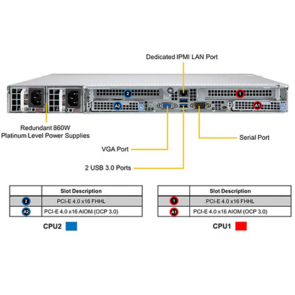 - 2x PCI-E 4.0 x16 FHHL; 2x PCI-E 4.0 x16 AIOM (OCP 3.0); 2x PCI-E 3.0 x2 NVMe M.2