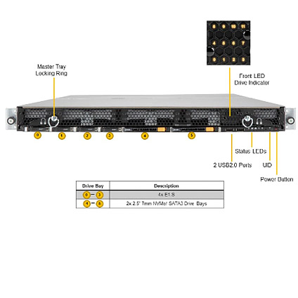4x Hot-swap EDSFF Short Bays, 2x 2.5" 7mm NVMe/Hot-Swap SATA Drive Bays