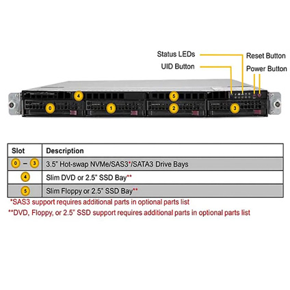 The Supermicro Ultra SuperServer 610U-TNR 1U 29.7" depth Rackmount server features 3rd Gen. Intel® Xeon® Scalable Processor, up to 12.0TB Memory, The Supermicro Server 610U-TNR comes with 4x 3.5" hot-swap NVMe/SATA/SAS drive bays, eight 40mm heavy duty fans, and is equipped with 1200W redundant power supply.