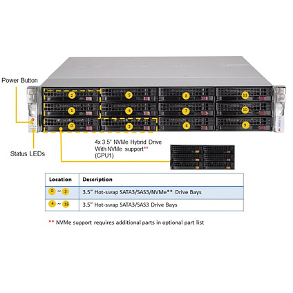 - 16x Hot-swap 3.5" SATA3/ SAS3 drive bays (4 NVMe Hybrid Ports)