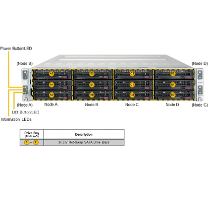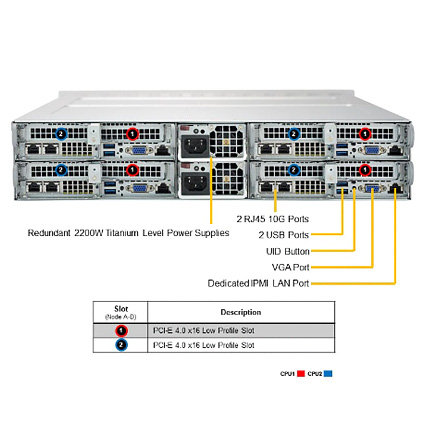 - ASPEED AST2600 BMC, 2 USB, VGA. RoT, 2 SATADOM ports SATA (6Gbps); 3 slots per node; RAID 0, 1, 5 support.