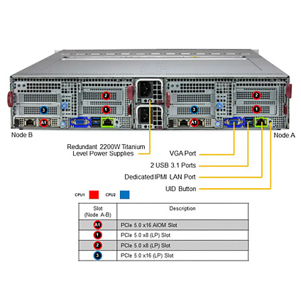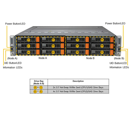 The Supermicro BigTwin SuperServer 621BT-DNC8R is a 30.5" depth 2U 2-nodes high performance rackmount server. Each nodes supports dual 4th/5th Gen. Intel Xeon Scalable Processor, 16x DIMM slots supports up to 4.0TB ECC DDR5 RDIMM memory. The Supermicro Server 621BT-DNC8R comes with 12x hot-swap 3.5" NVME/SAS drive bays, is equipped with 2200W redundant titanium level power supply.