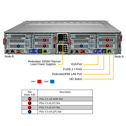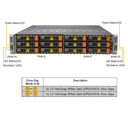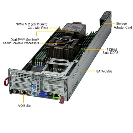The Supermicro BigTwin SuperServer 621BT-DNTR is a 30.5" depth 2U 2-nodes high performance rackmount server. Each nodes supports dual 4th/5th Gen. Intel Xeon Scalable Processor, 16x DIMM slots supports up to 4.0TB ECC DDR5 RDIMM memory. The Supermicro Server 621BT-DNTR comes with 12x hot-swap 3.5" NVME/SATA drive bays, is equipped with 2200W redundant titanium level power supply.