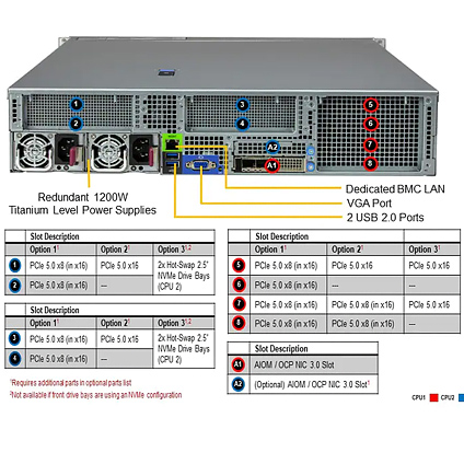 - Optional PCIe slot configurations up to 8 PCIe 5.0 x8 or 4 PCIe 5.0 x16 slots with support for double-width GPU/Accelerator cards