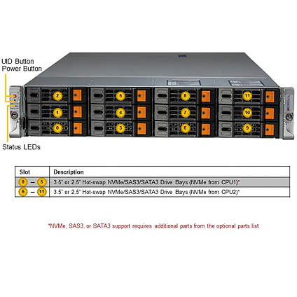 - 12x 3.5/2.5" hot-swap NVMe/SATA/SAS drive bays