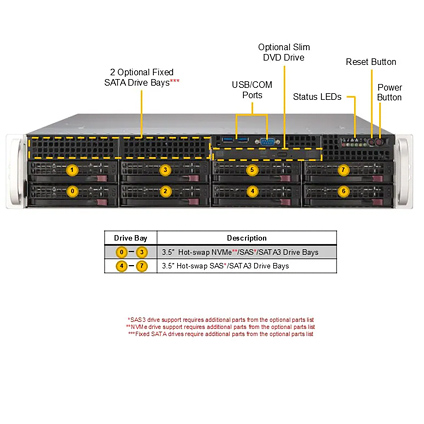 - 4x Hot-swap 3.5" NVMe/SAS/SATA + 4x Hot-swap 3.5" SAS/SATA drive bays