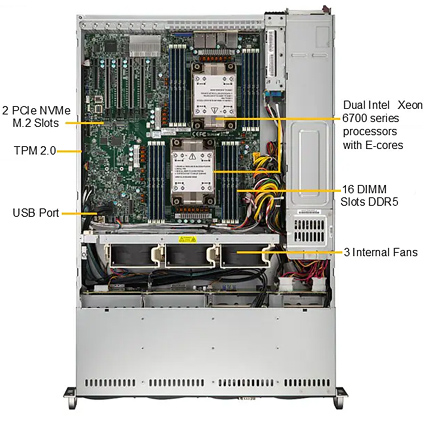 - Dual Intel Xeon 6700/6500 series processors with P-cores or 6700 series processors with E-cores, up to 350W TDP (air cooled)