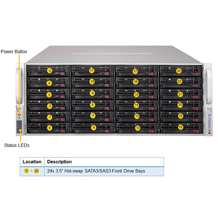 - 36x Hot-swap 3.5"/2.5" SATA3/ SAS3 drive bays (4 Hybrid NVMe)