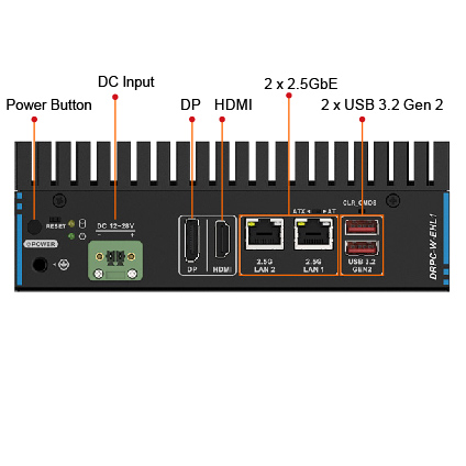 The DRPC-W-EHL1 is a compact, fanless DIN-rail computer built for industrial automation and space-constrained environments. It is powered by an onboard Intel Elkhart Lake Atom x6000 series SoC, balancing efficient performance with low power consumption. The system supports a dual independent display and features high-speed I/O, including USB 3.2 Gen 2 and SATA 6Gb/s ports. For robust connectivity, it is equipped with dual 2.5 GbE LAN ports using Intel I225-IT controllers and offers further expansion capabilities through one M.2 A-Key and one M.2 B-Key slot for adding wireless communication and high-speed storage.