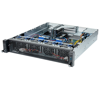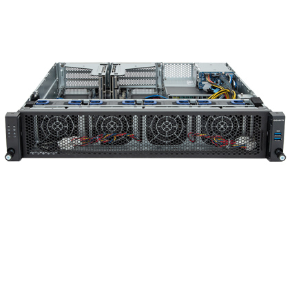 The Gigabyte Server E263-Z30 (Rev. AAD1) 2U Rackmount Server features single socket AMD EPYC 9004 Series Processors, 12x DDR5 ECC RDIMM slots. The E263-Z30 (Rev. AAD1) supports up to 2 x dual slot Gen5 GPUs, comes with 2 x 2.5" NVMe/SATA/SAS hot-swappable bays on rear side, is equipped with 4x 80mm cooling fans, and 1600W 80 Plus Platinum redundant power supply.