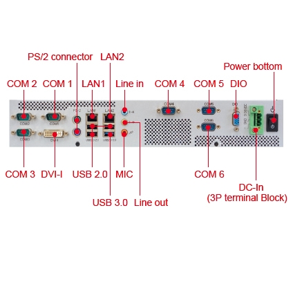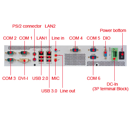The I/O consists of one DVI-I, three USB 2.0, one USB 3.0, two LAN ports, six COM ports and a digital I/O consisting of four in and four out. There are also two ps/2 ports.