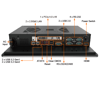 The PPC2-CW19-ADL heavy industrial panel PC is a formidable computing solution engineered for the most demanding industrial environments. Powered by the 12th Gen Intel Processors Platform, it delivers exceptional processing power and efficiency. Featuring a PCIe Gen4 x16 slot (x16 signal), it offers extensive expansion possibilities for a wide range of peripherals and add-ons. The anti-glare and anti-UV PCAP touchscreen not only ensures optimal visibility and durability but also supports gloved and wet hand operation, enhancing usability in various conditions. The newly designed panel mount kit simplifies installation, and the inclusion of a new graphical BIOS interface streamlines system management and configuration. The PPC2-CW19-ADL is the ultimate choice for industrial applications requiring top-tier performance, reliability, and adaptability.