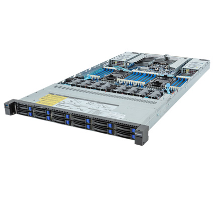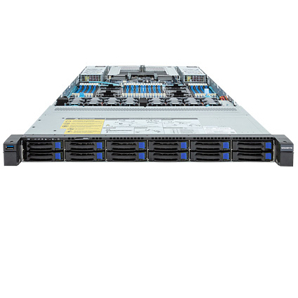 The Gigabyte Server R183-S92 (Rev. AAD3) 1U Rackmount Server features dual socket 4th Gen Intel Xeon Scalable Processors, 32x DDR5 ECC RDIMM slots, comes with 12x 2.5" hot-swappable SATA drive bays, and is equipped with 1600W 80 plus platinum redundant power supply.