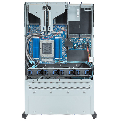 The Gigabyte R263-Z30 (rev. AAC2) is a versatile 2U server powered by AMD EPYC 9004 series processors with AMD 3D V-Cache technology, 12x DIMMs 12-Channel RDIMM DDR5 memory. For storage capabilities the R263-Z30 (REV. AAC2) has has 4 x 3.5"/2.5" Gen4 NVMe/SATA/SAS hot-swap drive bays, 8 x 3.5"/2.5" SATA/SAS hot-swap drive bays. For expansion purposes there are 2 x FHHL PCIe 5.0 x16, 3 x FHHL PCIe 4.0 x16 and x8, and 2 x OCP 3.0 Gen5 x16 slots. The Gigabyte Server R263-Z30 (rev. AAC2) is equipped with 4 x 80mm 18,300 RPM cooling fans, and 1300W redundant 80 Plus platinum power supplies.